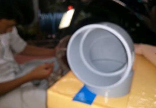 Sau đó dùng dao rọc giấy tạo 2 lỗ tròn, cố định phần quạt để bàn với hướng của lồng quạt quay vào trong thùng xốp và đoạn ống nước hình chữ L.